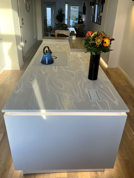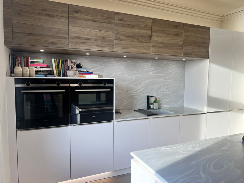 Amazing use of Corian on the island and sink run with a coved upstand creates an amazing seamless feature wall behind the sink. We love the Elica Switch Induction hob with Downdraft extractor in White, this disappears nicely with the choice of Corian worktop.